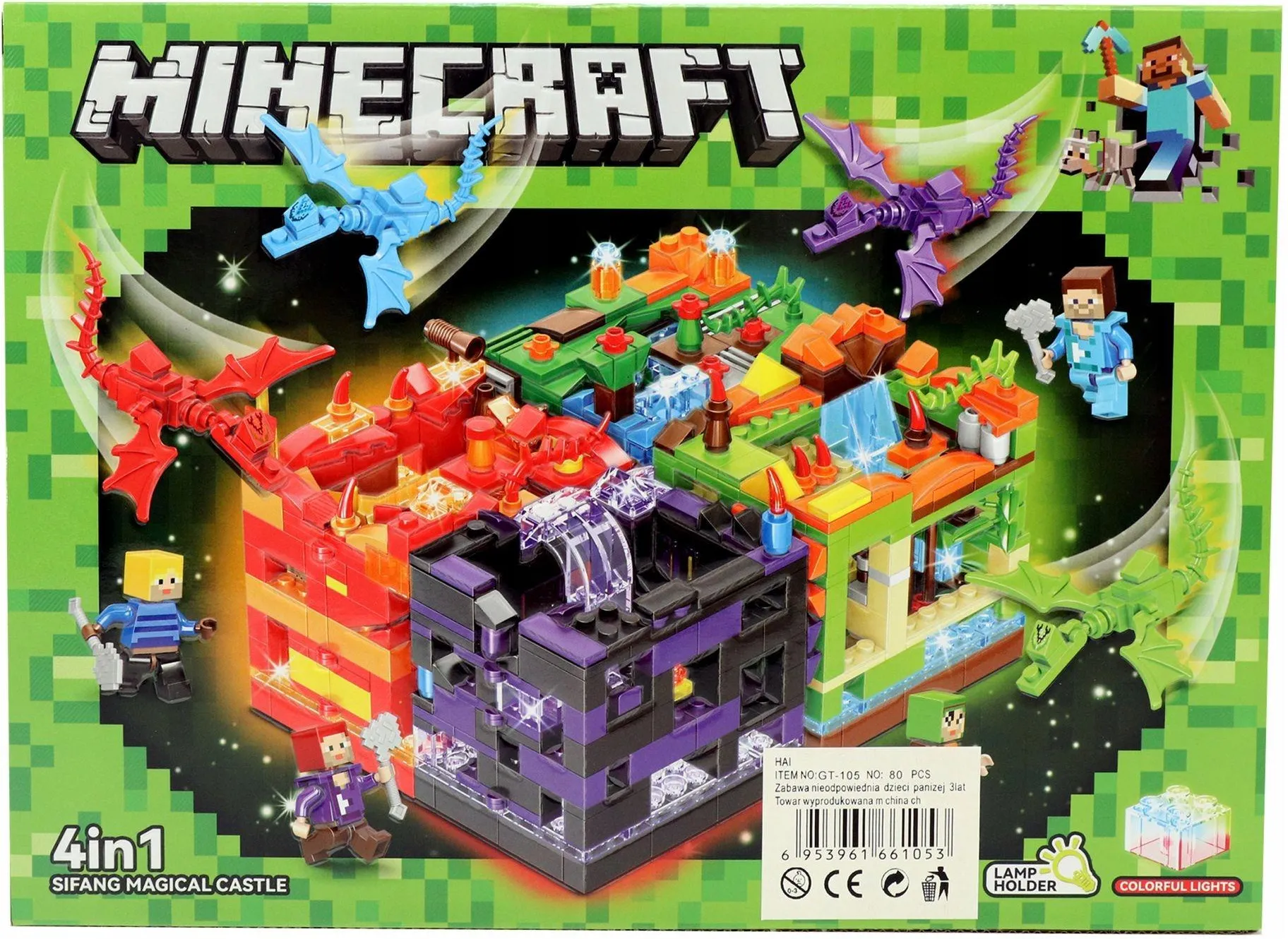 W zestawie znajdziesz figurki inspirowane postaciami z Minecraft – w tym zielonego smoka i bohatera z kilofem – gotowych do walki o przetrwanie!